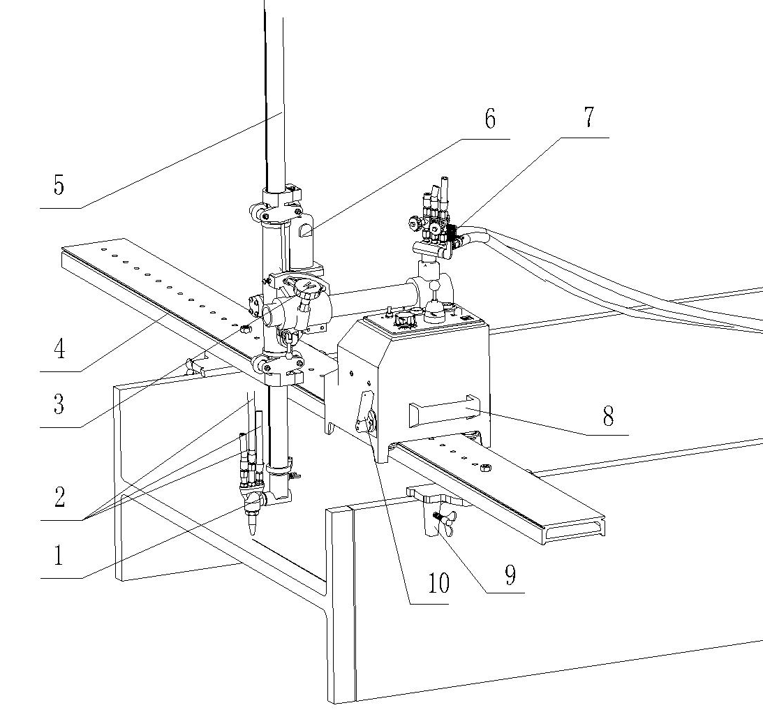 3. 橫向調(diào)節(jié)手輪:控制割炬的橫向移動 9. 軌道壓板:在H型鋼上定位機器