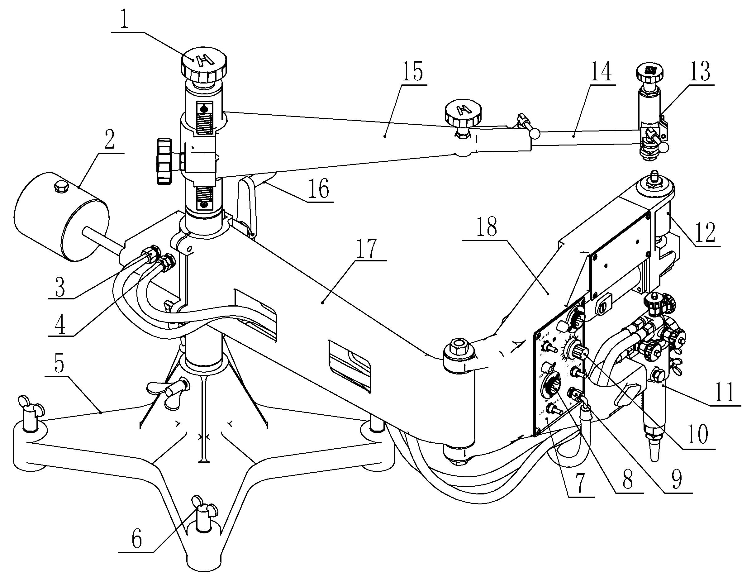 11.割炬 12.磁性套總成 13.樣板架:用于固定樣板,還可以垂直調節板的上下高度。 14.橫移齒條 15.形臂 16.主臂升降手柄 17.主臂 18.叉臂 |