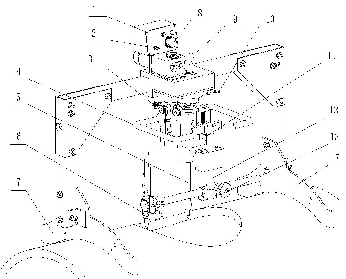 “HK-600D”便攜式管孔氣體切割機,此裝置主要用于高壓容器,熱交換器的相交,連接管孔的T形接頭的高精度切割。管道相交焊接需要在主管(筒體)開孔切割。該機器是通過割炬自動上升/下降的自鎖機構,利用三角學的原理使機械裝置能夠精確跟蹤筒體曲面,來實現割炬運行的軌跡。在設計上已周密的考慮,盡量減輕機器重量,便于攜帶方便。應用無限旋轉氣體分配器,使管路不纏繞。該機器也可做普通的平面圓切斷或坡口切割。機器是由控制箱,割炬及割炬自動上升/下降的自鎖機構,主體機架所組成。各部件都由主體機架相連。通過離合裝置,使機器的運行部件脫離電動裝置而實現手動旋轉割炬,使割炬快速對齊切割起始點。機器的控制箱安裝在切割機構頂部,操作簡便,易于維修。
