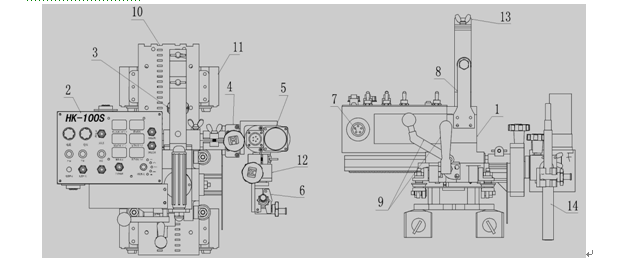 HK-100S由小車本體、控制箱,X-Y滑塊,焊槍夾具,導向輪,直線導軌等部件組成。