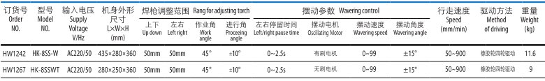 HK-8SSWT擺動式垂直焊接小車,擺動速度,擺動角度,中心偏移位置和左右停留時間均可以調(diào)整,適合各種不同規(guī)格的焊道。手柄為磁控式,移動此手柄可以部分的減少磁力,便于清理鐵質(zhì)垃圾和移動小車。安裝有永久磁鐵與平面導(dǎo)軌,避免小車脫離焊接線的現(xiàn)象。