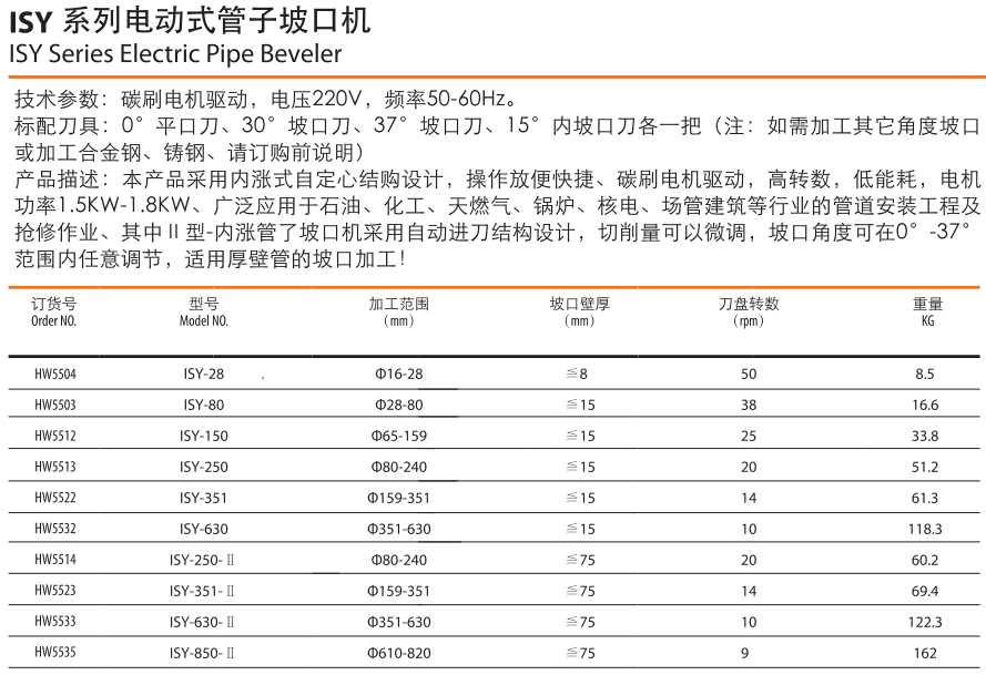 ISY系列內(nèi)漲式電動(dòng)管子坡口機(jī)是本公司研制的輕便型的鋼管坡口加工機(jī)具。該系列坡口機(jī)專為內(nèi)徑為Φ28~Φ360mm的鋼管倒角而設(shè)計(jì)。本系列鋼管坡口機(jī),采用交流220V電機(jī)作為動(dòng)力,內(nèi)漲式結(jié)構(gòu),自鋼管中心,操作方便。全新的設(shè)計(jì)理念和造型、卓越的使用性能,使其處于國(guó)內(nèi)坡口加工技術(shù)的領(lǐng)先地位。本機(jī)可對(duì)鋼管進(jìn)行坡口、平面法蘭加工。無論管壁厚薄,其加工性能與效率比起傳統(tǒng)工藝都有著不可替代的優(yōu)勢(shì)。