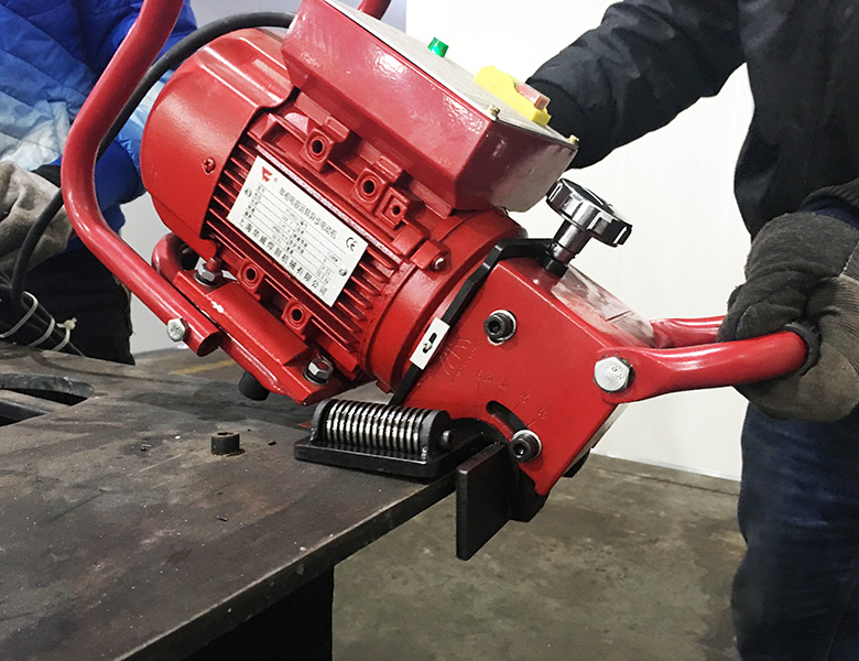 在啟動(dòng)之前,請注意坡口機(jī)的放置位置,不同的位置采用不同的操作方式。如果你需要把它放于工件的邊緣,則以平行方式固定設(shè)備,使刀盤不碰觸工件(工作臺長度的2/3)。然后啟動(dòng),不斷地慢慢地引導(dǎo)銑刀沿箭頭指示的方向工作。